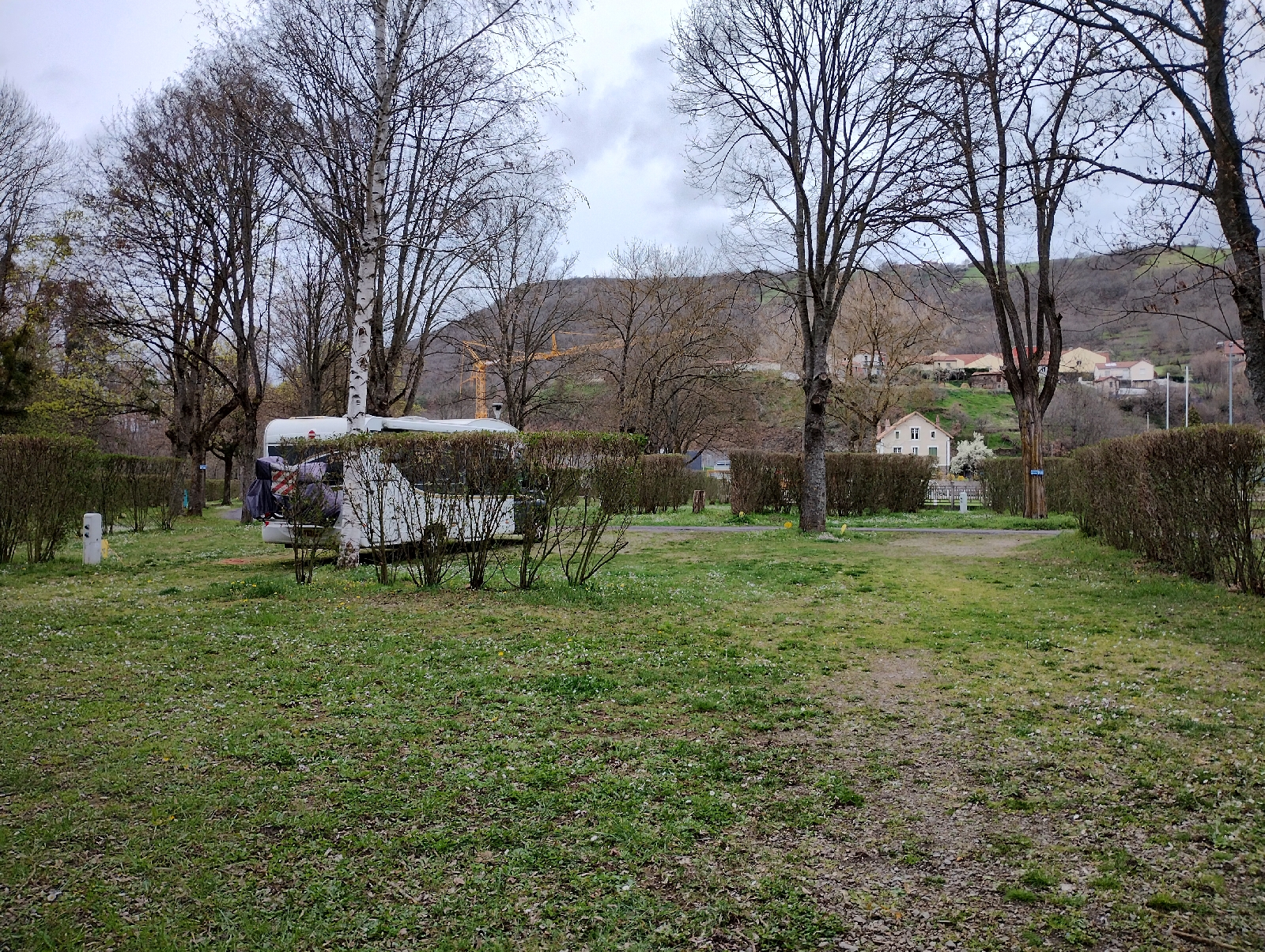 The site was very puddly. A weedy gravel track runs between the pitches of the old municipal, we decided to park-up on that rather than risk getting bogged down in the spongy marked emplacements.